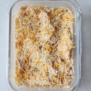 - Drain the canned chicken and add it to an oven- or microwave-safe dish. Mix in the whipped cottage cheese, cream cheese, buffalo sauce, and ranch seasoning until fully combined. Top with shredded cheese.